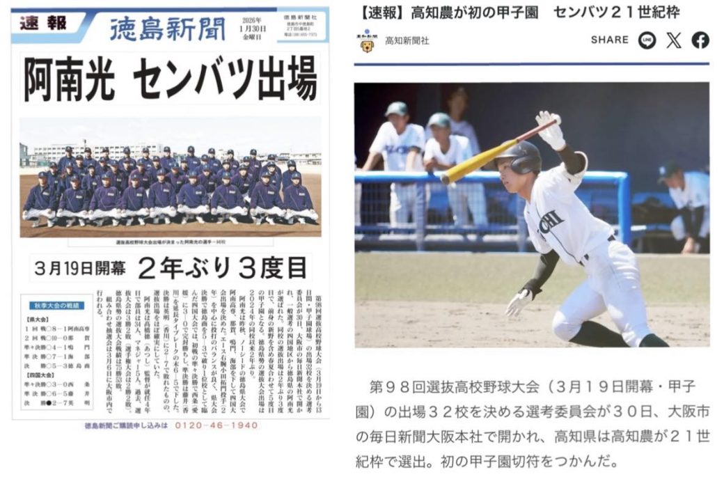 2026.01.30 徳島・高知を翔ける 阿南光、高知農業――球春を告げる甲子園への挑戦 球春到来⚾️ 阿南光(2年ぶり3度目) 高知農業(初出場21世紀枠) 2026WBC決勝後から始まる、球児たちの戦いに期待しています!